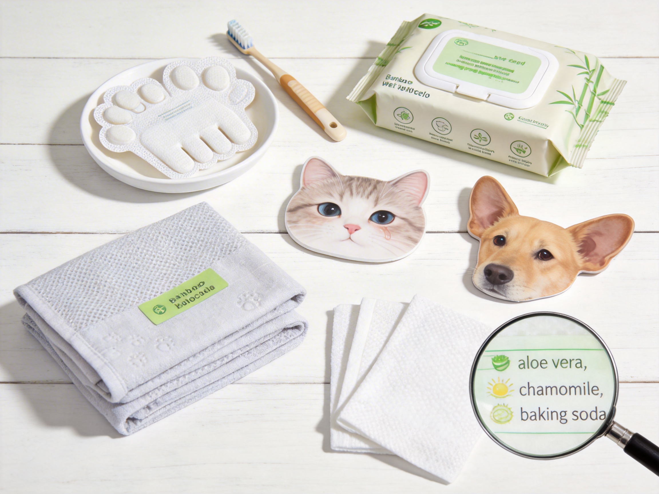 Unlike generic wipes that offer only basic cleaning, our products are formulated to address specific pet needs: - Teeth Wipes: Infused with baking soda to neutralize bad breath and gentle abrasives to remove plaque. - Eye Wipes: Contain chamomile extract to soothe irritated eyes and reduce redness. - Ear Wipes: Formulated with salicylic acid to dissolve wax and aloe vera to moisturize the ear canal. - Body Wipes: Include oatmeal and aloe vera for sensitive skin, plus deodorizing agents to neutralize pet odors.